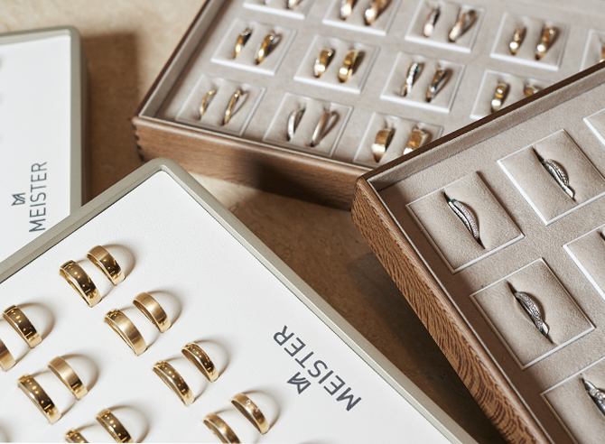 „Für klassische Trauringe benötigen wir zwei bis drei Wochen, für ausgefasste Modelle vier Wochen. Wenn es schneller gehen muss, machen wir natürlich auch das möglich, aber idealerweise kommen Paare zwei bis vier Monate vor der Hochzeit zu uns.“