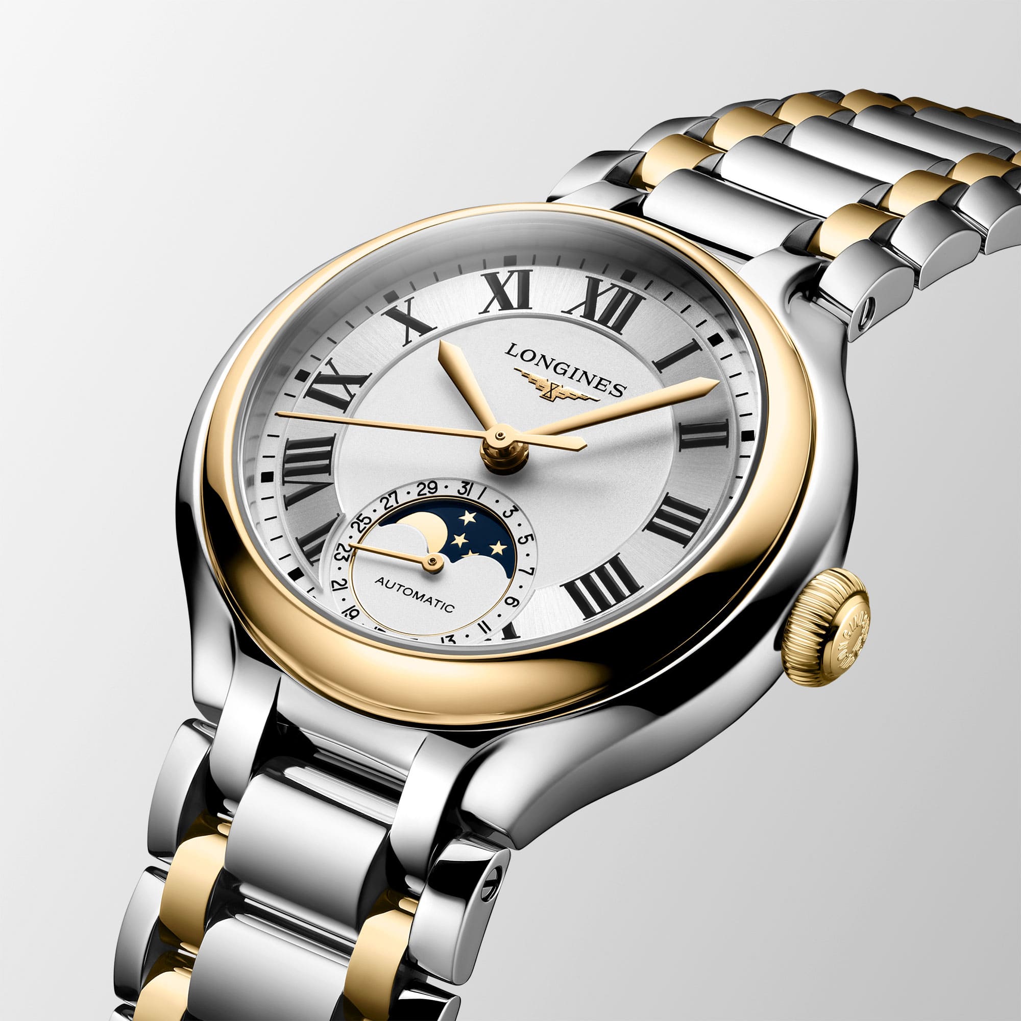 Stunden, Minuten, Sekunden, Mondphasenanzeige mit Kalender bei 6 Uhr