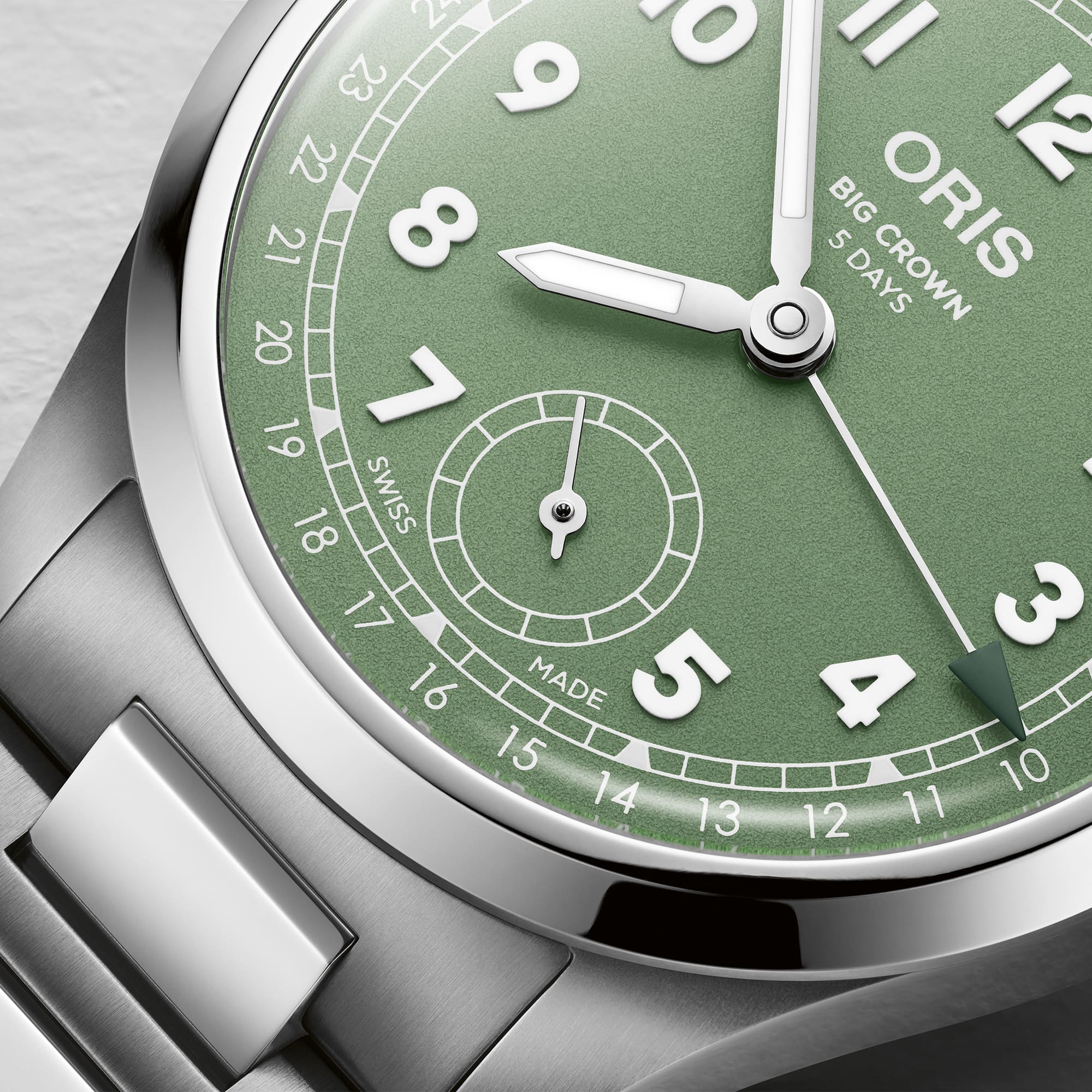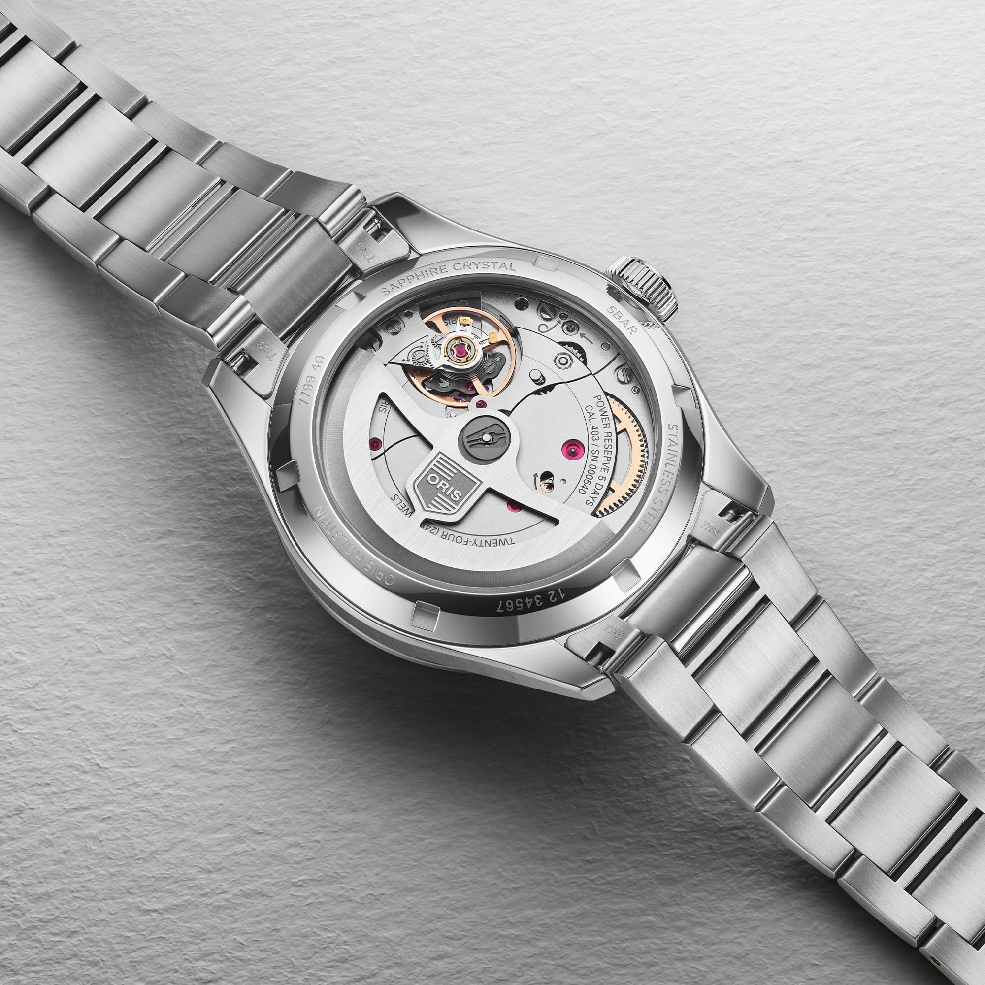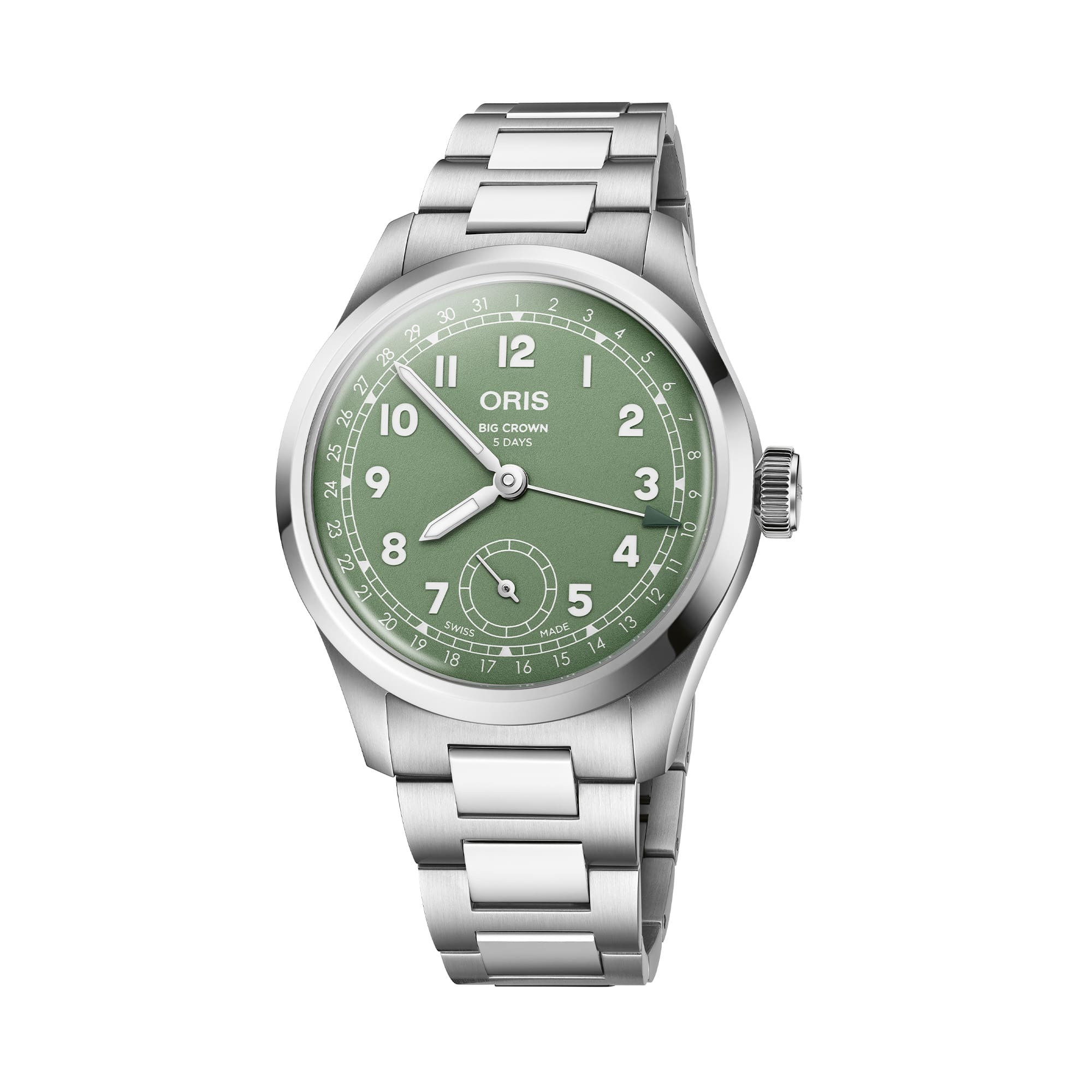 Zentraler Stunden- und Minutenzeiger, kleine Sekunde bei 6 Uhr, zentraler Datumszeiger, augenblicklicher Datumswechsel, Datums-Korrektor, Feinregulierung und Sekunden-Stopp
